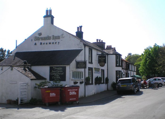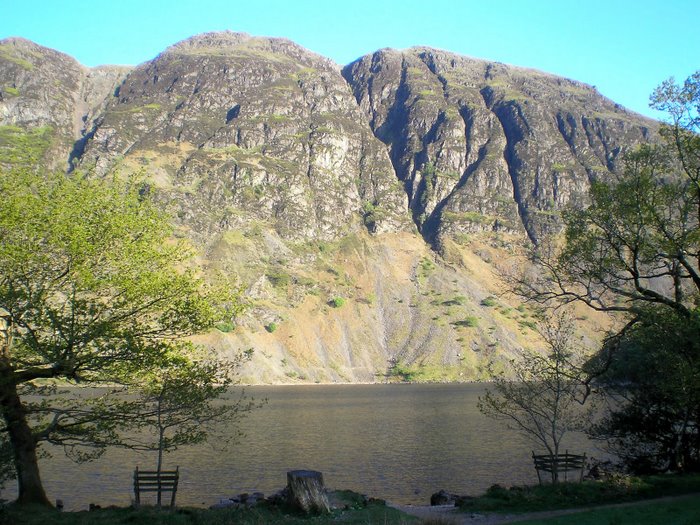 I burst out of the dark forest into bright sunlight on a high ridge overlooking Strands (Nether Wasdale) and Wastwater. I followed the Whin Rigg ridge a little way for the views and not a little curiosity, then turned back to the path down to Wasdale. It's early yet for the hostel opening so I diverted over to the Strands Inn for a pint of Marlston's Oyster Stout and sat outside with three walkers.