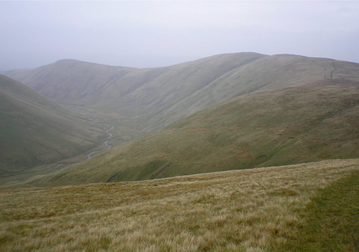Weather was overcast and started a slow rain, so I put on the Duck’s Back. I was on a high ridge that turns southwest, climbing more as I topped a couple more summits. I could look back and see my path all the way down to West Fell.
