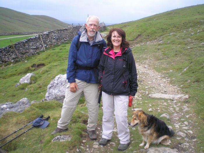 As I pass above Stockdale Farm, I stopped for a short rest and water. The two walkers catch up, we chat and they notice my DHW guidebook. She says “we wrote it”. The are none other than Chris and Tony Grogan, the DHW guidebook authors. I introduce myself and they know of my walk from the walkers forum. Meanwhile, it starts raining and we put on rain gear. We chat and walk awhile together to Landscar where they loop back to Settle, just out for a day’s walk. It was a pleasure to get to know them.