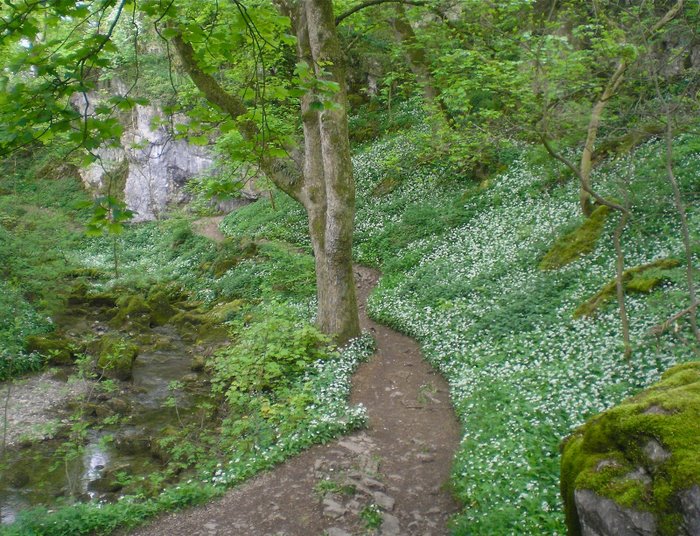 I was off by 8:50 and walked the 1½ miles to Janet’s Foss. Foss is the old Norse word for waterfall, Janet means the local fairy queen who typically lives in a cave behind the falls. Its a wonderful, hidden, intimate spot, boulders strategically placed by Janet to guard the pool, water from the falls streaming over the rocks surrounding the pool and into the beck threading through trees. The trail along the beck is lined with wild garlic giving off a heady smell, its stems a pungent taste. This is a very feminine place, almost erotic.