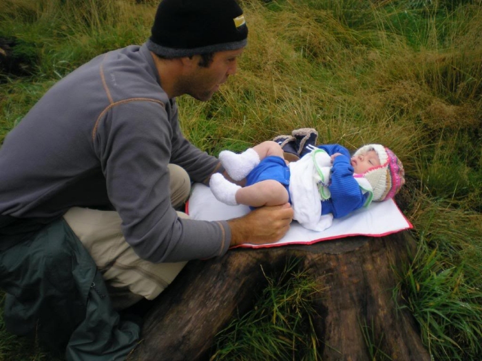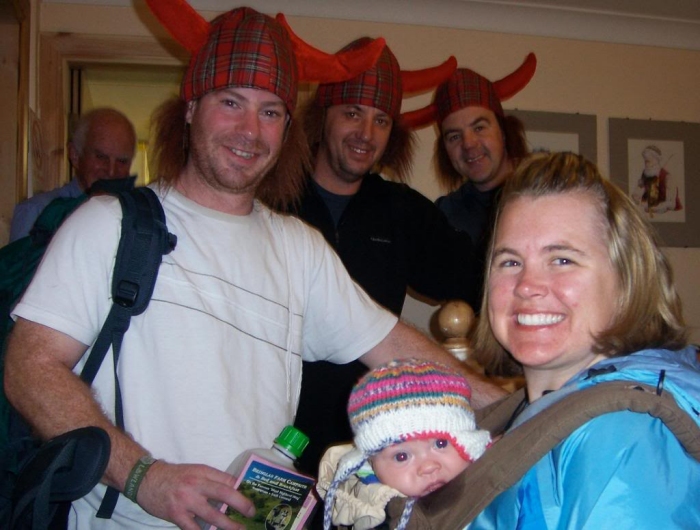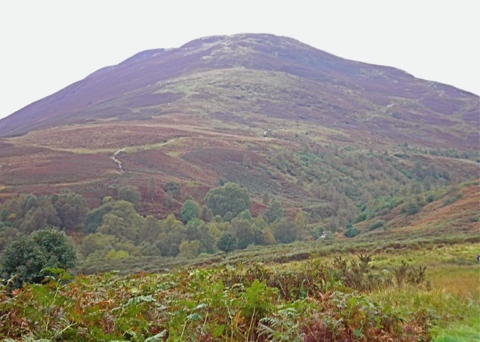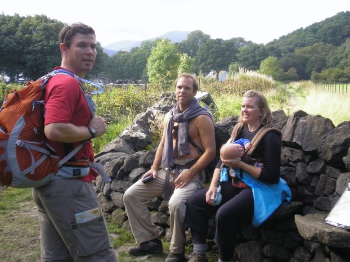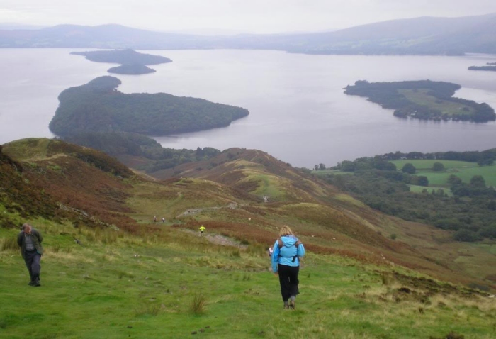 Off by 9:10, a little better timing than yesterday. Over hills and through forests. Stopped for a diaper change on a big tree stump. Nearing Conic Hill, we had our first views of Loch Lomond and its many isles. What a grand approach to Conic. We crossed several burns (gullys w/water) before starting the long climb up Conic Hill. Everyone wanted to take the side trail up to the summit and had a good time exploring the three peaks and taking in the views. This is where the Highlands begin!