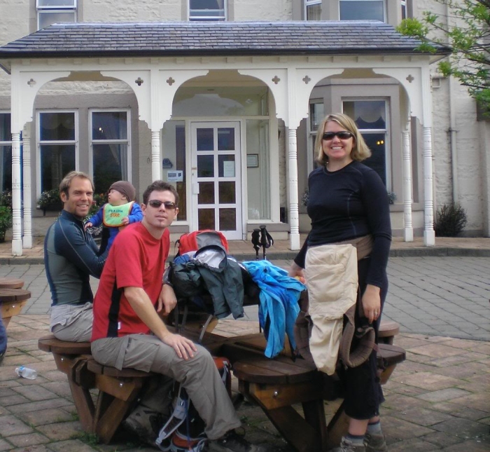Stopped for an hour at the Inversaid Hotel for lunch and coffee using the patio tables. We have found that Naomi needs a one hour break twice a day to feed Braylon, change his diaper and give him some play time out of his carrier. We see quite a few walkers from the last two days. There was Pete leaving before us again, the New Zealand couple with the one yr old, and a wonderful couple from over on the coast. She, an energetic 77 yr old, he, 84 yrs old with a twinkle in the eye, a quip on the tongue and a most infectious laugh.