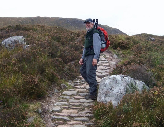 Descending steeply, we pass over two burns with stepping stones and slabs to keep our feet dry. As we round the mountain, a far view of Blackwater Reservior, then down, down, down into Kinlochleven.