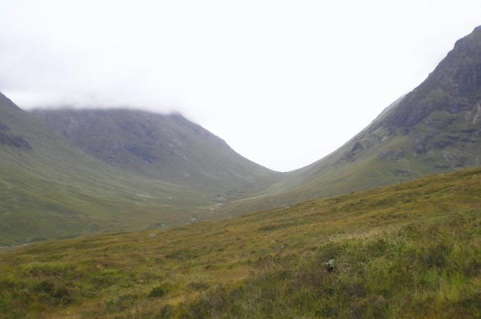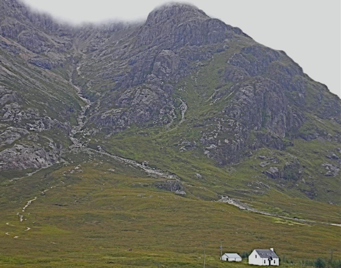 It’s a cloudy but nice day. The crags of Buachaille Etive Mor on the south side of Glencoe are spectacular, but I wish they weren’t swathed in clouds near the tops. Looking west along the Glencoe valley, there is a wonderful cup formation between the mountains. Reminds me of High Cup Nick on the Pennine Way but not so spectacular. Across the road is the climbers staging hut for the walk up Coire na Tulaich where one can gain the ridge. Oh well, another day!