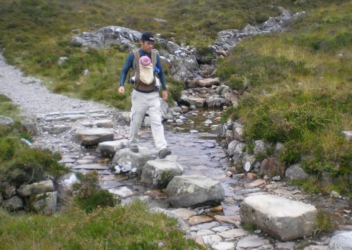 At Altnafeadh, we turn away from the valley and begin climbing. We keep meeting people from past days as we climb the infamous Devil’s Staircase. It is steep but not particularly hard, actually has stone steps, a carefully built military road from about 1750. We stop at the cairn on the summit to feed Bray, change diaper and have a little playtime. The views here are so spectacular. There are paths up the hills on both sides of the Way so I follow them a bit. The one on the left, I think, is a good alternative to the WHW, but we can see our path tracing ahead across a bleak and boggy landscape, leading us ever on.